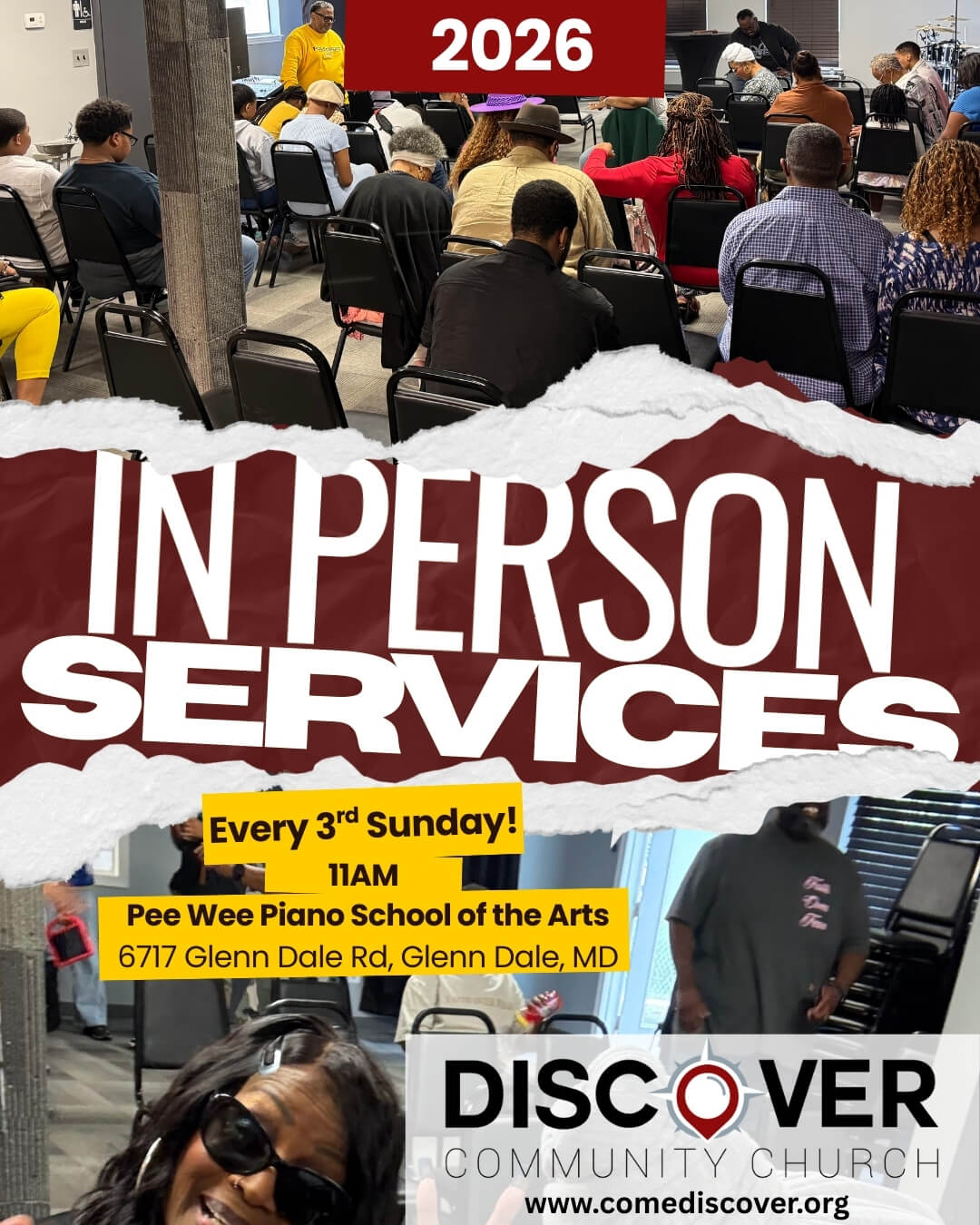 Live Stream (11:00am) DCC Kidz (11:15am) Welcome to Discover Community Church Love God.Love People.Make a Difference. upcoming events Upcoming DCC Live Services!Join us in person every 3rd Sunday at Pee Wee Piano School of the Arts, 6717 Glenn Dale Road, Glenn Dale, MD! Learn more about DCC! Most recent message DCC Social comediscoverus A faith community dedicated to corporate and self-discovery, loving hard, and growing an irresistible church. The latest issue of our Discover Us Newsletter is β¨ New Year, New Goals β¨ 2026 is here, and itβs tim What a year. As we welcome 2026, let's take some Happy New Year from Discover Community Church! Ne Merry Christmas from Discover Community Church! T π βFor unto us a Child is born, unto us a Son is g πβ¨ Whatβs your favorite Christmas songs? πΆ The hol Whatcha Reading Wednesday; Holiday Edition. This C πβ¨ Happy National Ugly Christmas Sweater Day! β¨π T πβ¨ Itβs the most wonderful time of the year! β¨π A What does your Self-Care Christmas look like? Comm Welcome to Whatcha Reading Wednesday; The Holiday πβ¨ Have you put up your Christmas tree yet? Commen What has been your favorite takeaway in the Keep D πͺβ¨ Happy National Cookie Day! β¨πͺ The sweetest day β¨ Advent Season is Here! β¨ A season of hope, peace O come, let us adore Him β Christ the Lord! ππ½β¨ Th You're Invited to DCCβs 2025 Christmas Party! It β¨ Advent Season Begins β¨ A season of waiting, wond Happy Thanksgiving from Discover Community Church! Load More Follow on Instagram